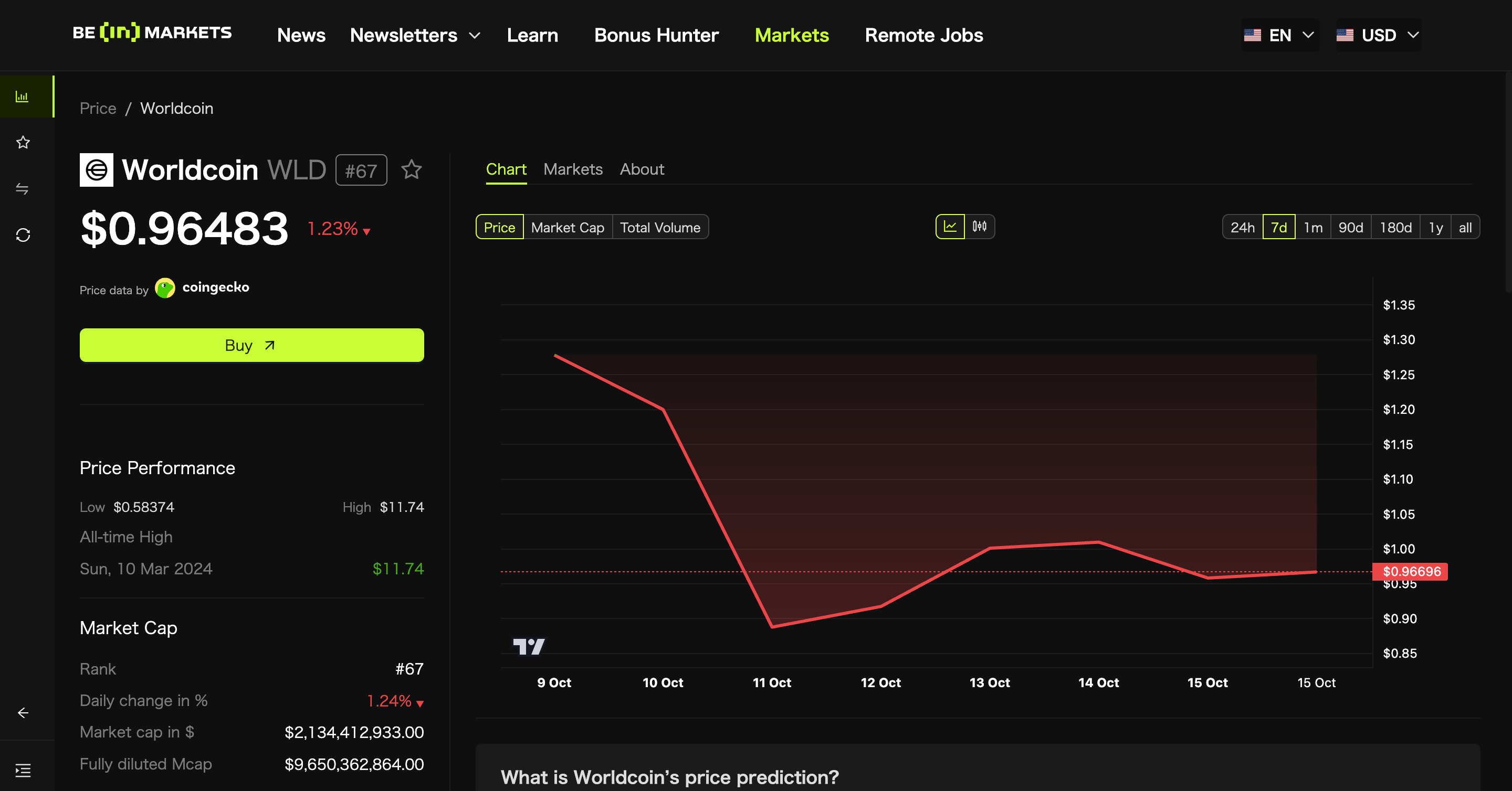 试点推进时值Web3生态剧烈波动。Tools for Humanity关联代币Worldcoin(WLD)现报0.96美元,较本周初1.35美元下跌,10月11日曾触及0.89美元低点。价格波动主要反映整体市场趋势,与广告试验无直接关联。