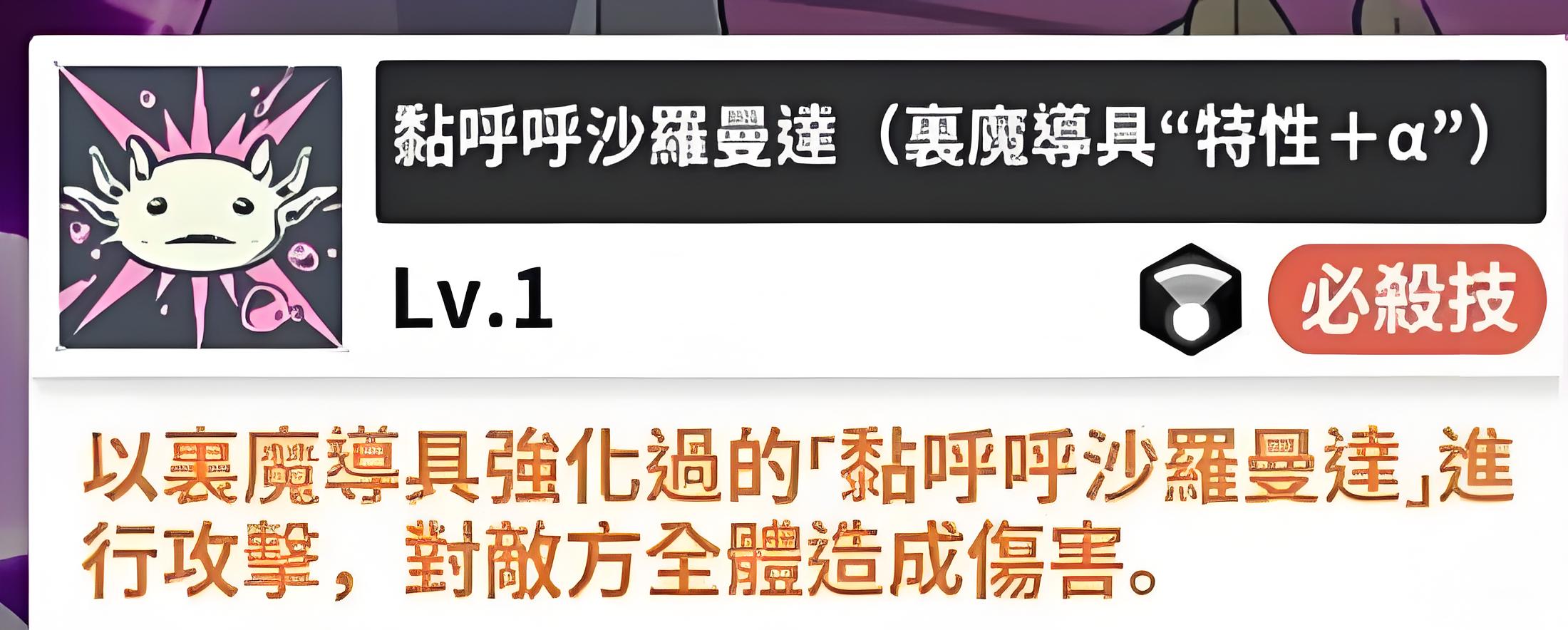 1、拍击是单体攻击技能,释放时召唤黏黏的沙鲁曼达对敌方单一目标造成伤害,命中后可将部分造成的伤害转化为自身生命值,具备一定吸血效果。