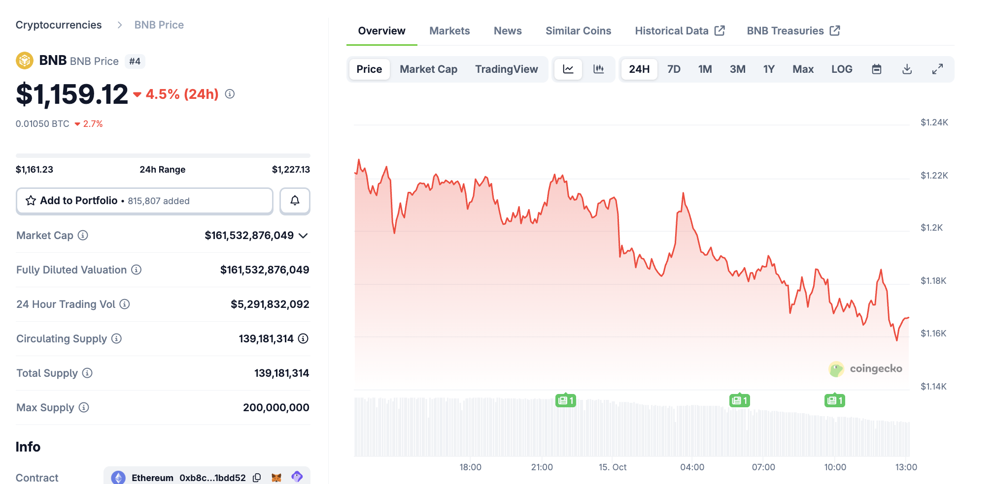 币安因在近期黑色星期五崩盘及其他丑闻中扮演的角色备受质疑,这种压力也传导至BNB——尽管Coinbase上线消息带来短暂拉升,该代币今日仍延续修正走势: