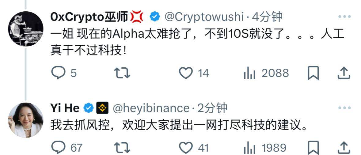 何一在 X 平台回复关于“币安 Alpha 中出现大量工作室账号”问题