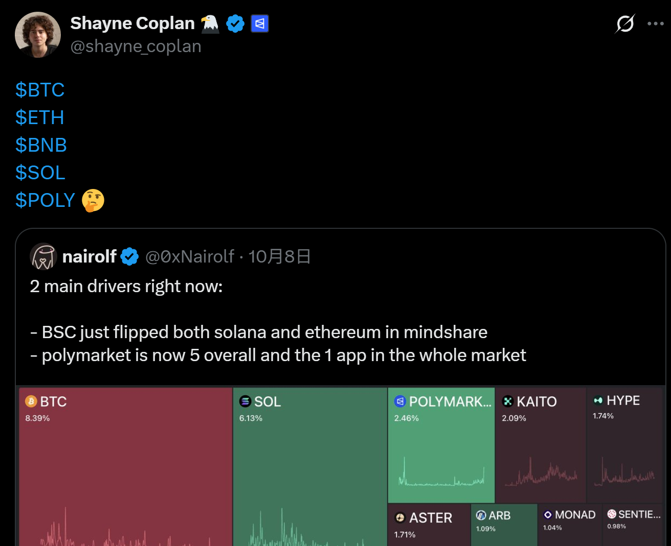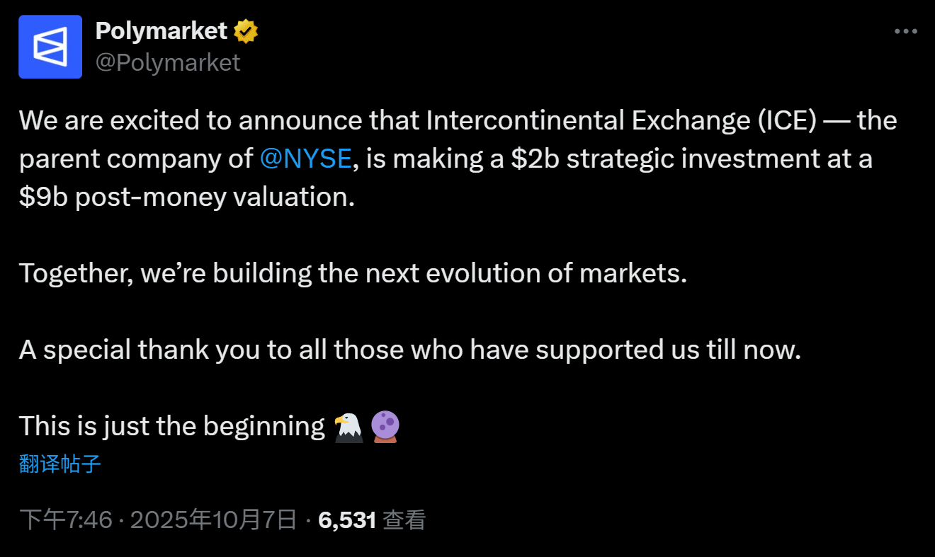 这也很可能和最新的 20 亿美元巨额融资是一个组合拳,且 Polymarket 首席执行官 Shayne Coplan 在 10 月 9 日也发布带有 POLY 符号的推文,可能成为两雄竞争的关键变量。