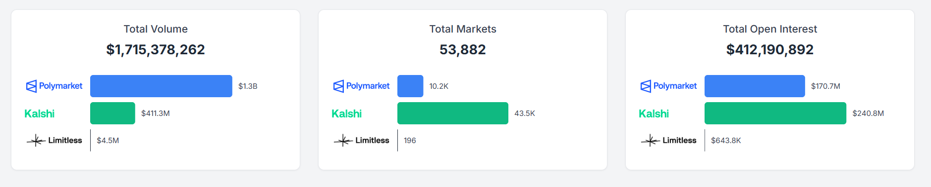 截至 2025 年 10 月 10 日,从 Polymarket 与 Kalshi 的数据对比来看,除了总交易量 Polymarket 以 13 亿美元 vs 4.1 亿美元大幅碾压之外,在市场数量(1.02 万 vs 4.35 万)及未平仓合约量(1.7 亿美元 vs 2.4 亿美元)上,Polymarket 均已落后 Kalshi。