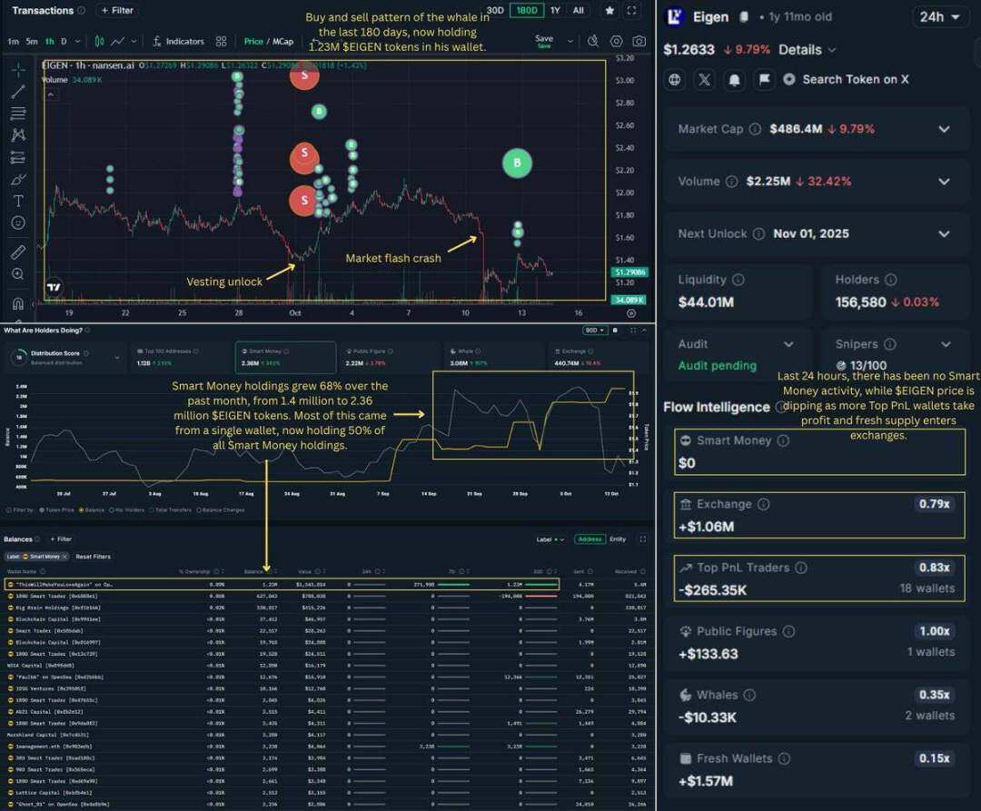 对于 $EIGEN,盈利的交易者在首次解锁前几周就已经退出,最成功的那些人在价格仍高于 $2 时离场。一位聪明资金的鲸鱼在暴跌期间大量买入,但随后完全陷入沉默。交易所的资金流入量在下一个解锁窗口到来之前持续上升。