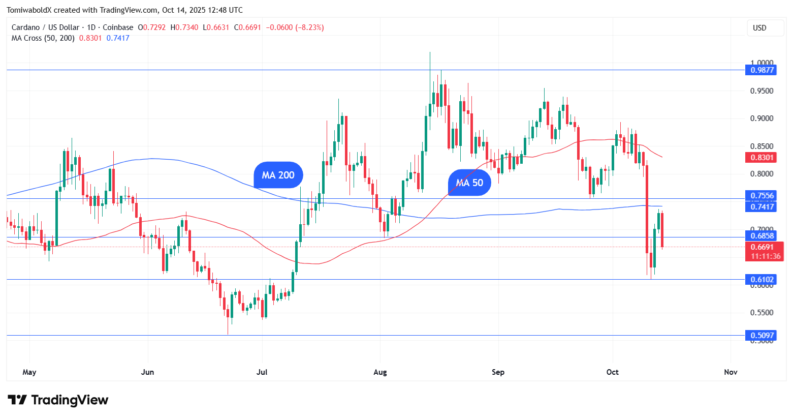 卡尔达诺在10月11日触及0.61美元的三日低点后反弹,连续两日上涨至10月13日的0.736美元,但遭遇空头强力压制,形成典型"死猫反弹"形态。