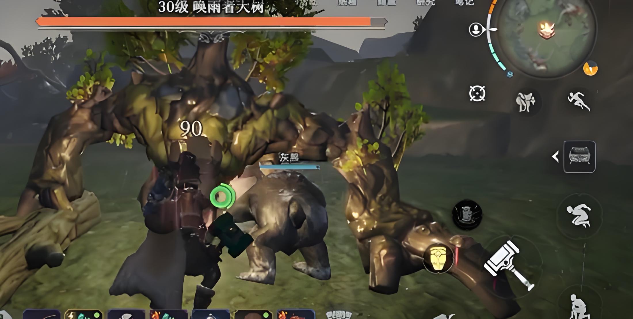1、唤雨者大树潜伏在泥土下呈枯萎树干状,玩家靠近其区域会触发战斗,初始用树干大范围攻击,推荐弓箭远程消耗或铁锤在安全时近战攻击。