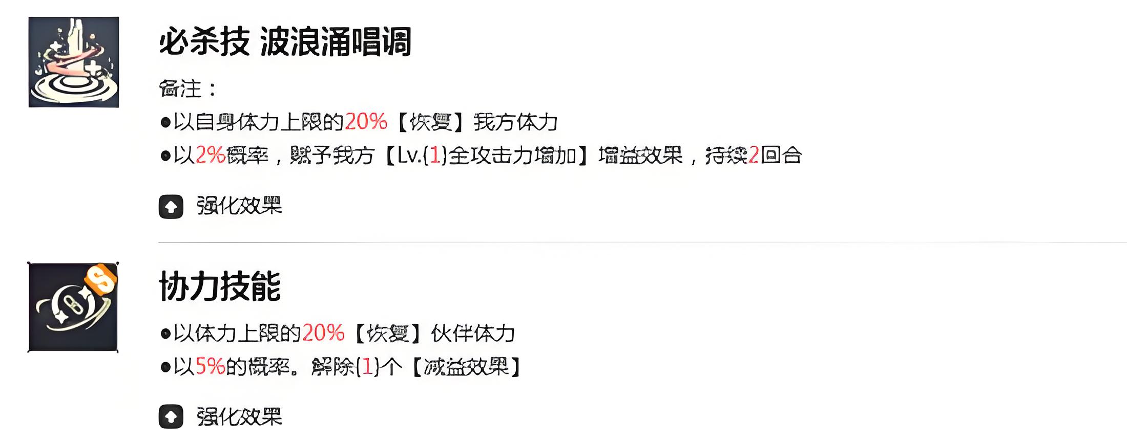 4、波浪涌唱调作为必杀技以自身最大体力20%为基础为全体队友回血,附带2%概率触发全体攻击力提升配合专属被动放大效果。