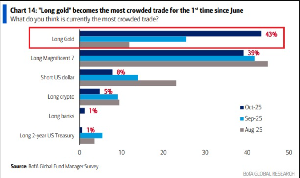 据Kobeissi Letter数据,43%的全球基金经理现认为"做多黄金"是最拥挤交易,而一年前该比例接近零。