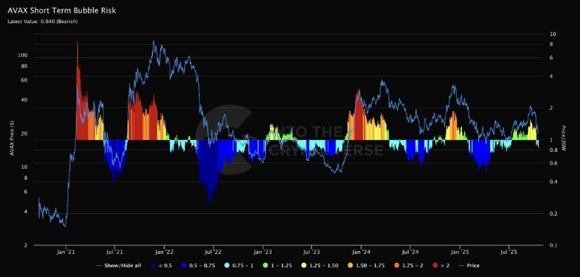 AVAX短期风险泡沫指标降温至中性,预示潜在布局机会。来源:Cryptoverse via X