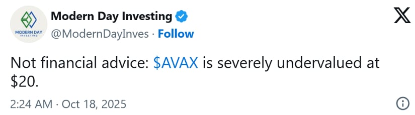 Modern Day Investing分析指出,当前20美元附近的AVAX价格处于严重低估区间,与历史积累带高度吻合。从技术面看,该区域同时对应2023-2024年需求区,强化其长期价值潜力。