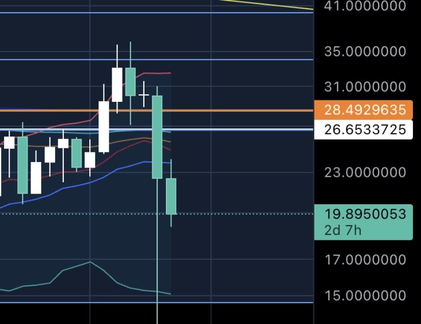 AVAX失守关键均线,空头测试19-20美元支撑区。来源:Pete via X