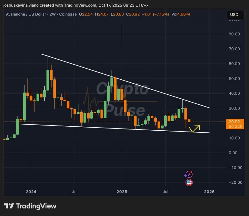 雪崩协议形成下降楔形,潜在看涨反转目标30-35美元。来源:CryptoPulse via X