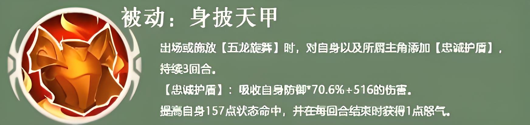 3、被动身披天甲出场或释放绝技时,给自身及主角加忠诚护盾持续回合,护盾吸收伤害并提升状态命中每回合结束获得怒气。
