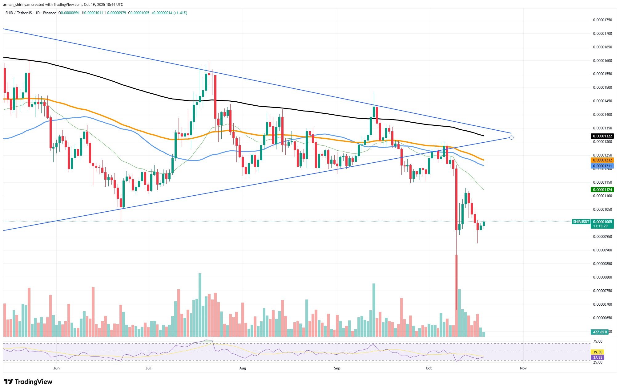 尽管波动剧烈,但最近几个交易周期呈现更小的K线实体和更低的交易量,这正是突破前市场犹豫的典型特征。从技术面看,柴犬币尚未重建任何有效的短期看涨结构,因其仍交投于三条关键均线(50日、100日及200日EMA)下方。