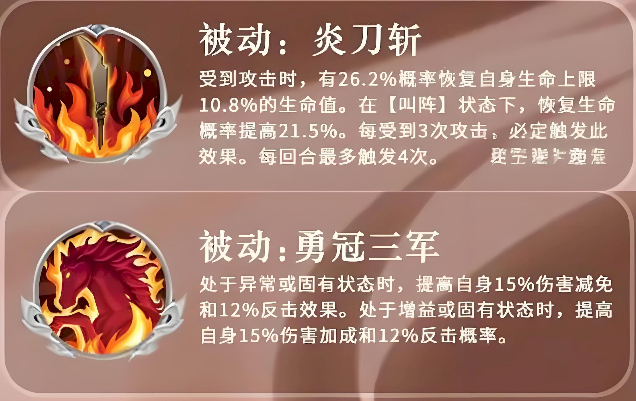 3、被动炎刀斩受攻击时有概率恢复生命值,叫阵状态下恢复概率会提高,每受一定次数攻击必定触发,每回合最多触发多次以增强续航能力。