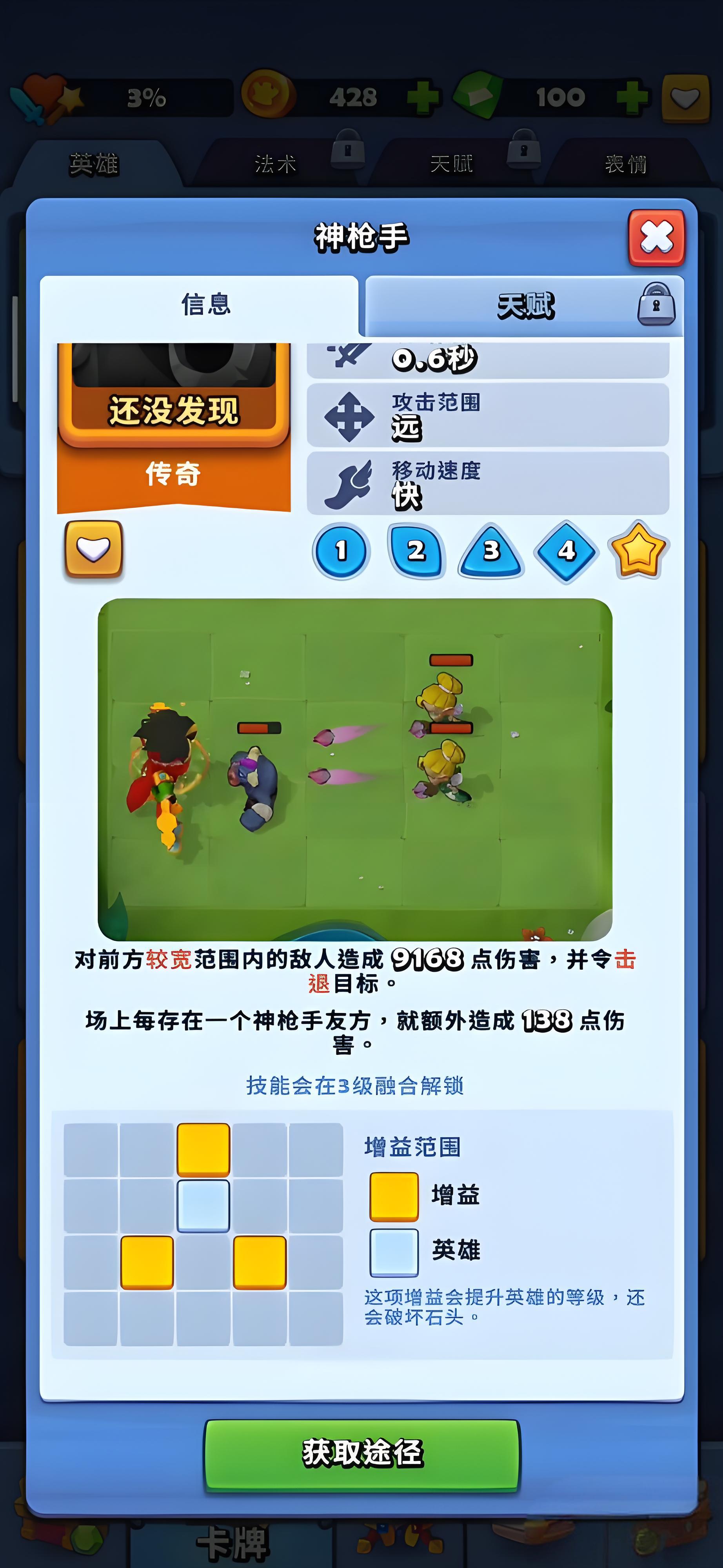 3、布阵时建议将神枪手放后排或角落,避免被近战突袭,其击退效果可保护自身与队友,需搭配钢铁骑士、维京战士等前排吸收伤害。