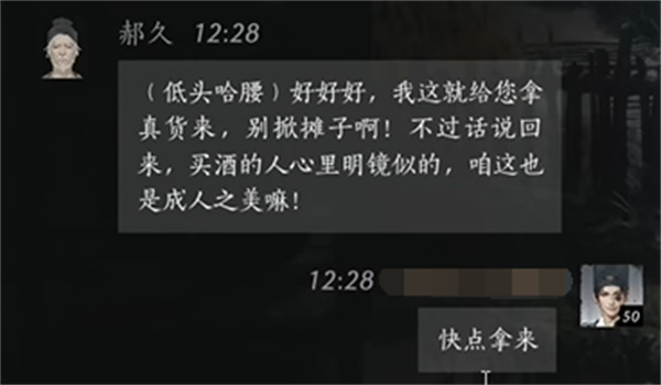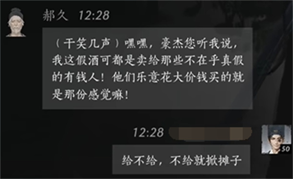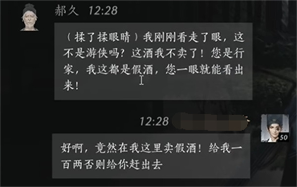 玩家:好啊,竟然在我这里卖假酒!给我一百两否则给你赶出去。