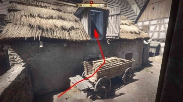 院子内有一个停靠在墙边的马车,随后我们爬上马车即可到达另一个谷仓。