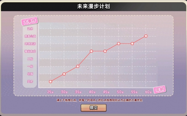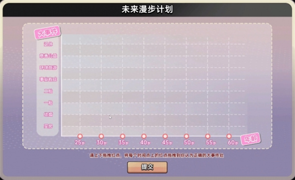 1、开答应玩游戏后,跳出来一张未来漫步计划表,拖动小红圈开始回答。