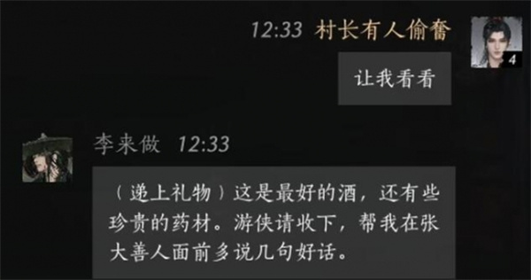 玩家:看你也不机灵 拿些礼物来 我与张大善人美言几句
