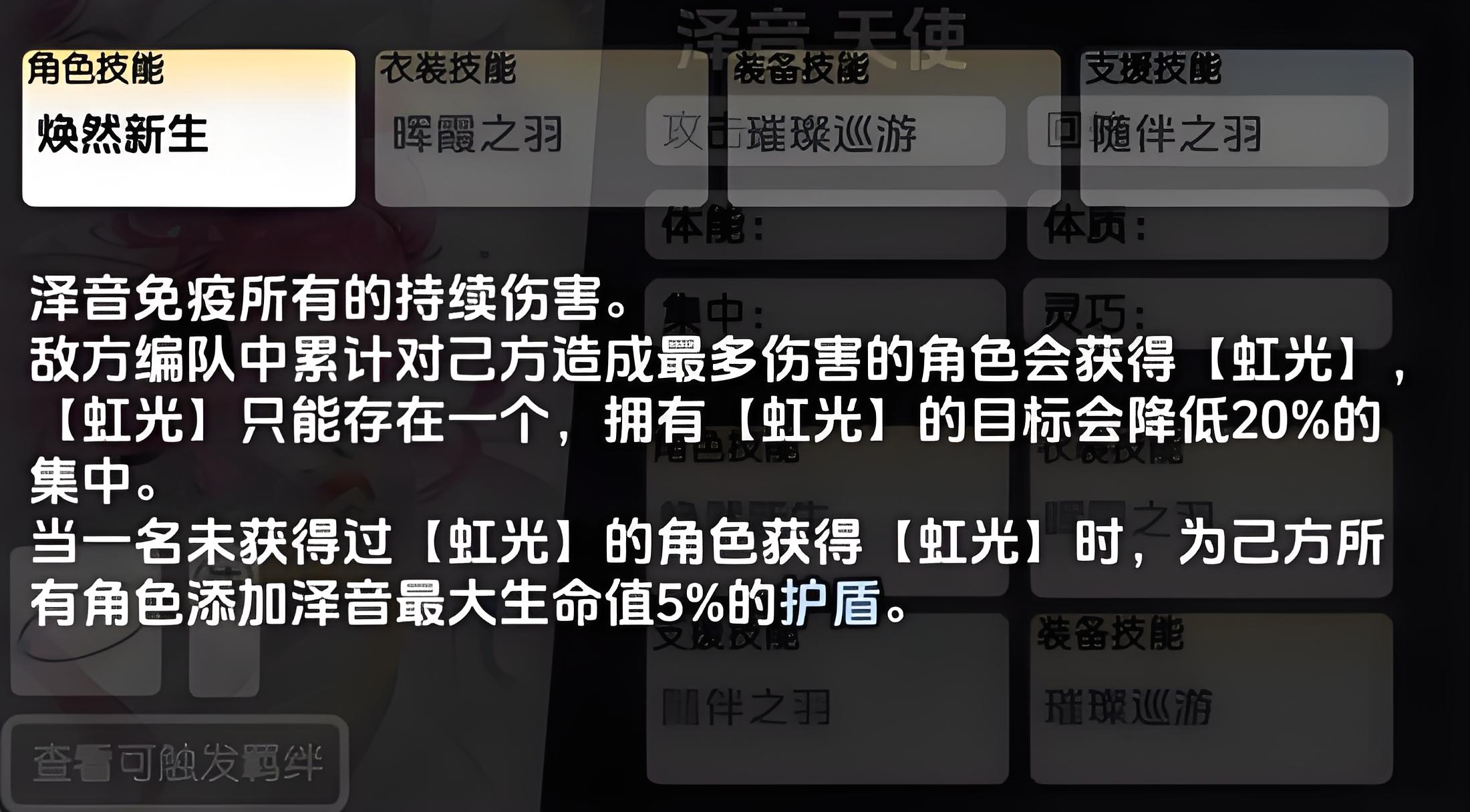 2、核心技能焕然新生释放后,自身免疫持续伤害,锁定敌方高伤害目标加虹光状态降20%集中首次标记时为全队加5%最大生命值护盾。