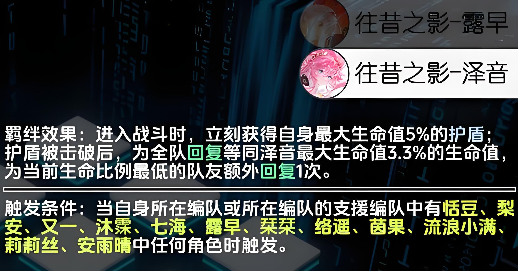 5、支援技能随伴之羽在己方角色血线降至特定比例时,立即回5%最大生命值,可打断低血危机,配柚恩和露早还能激活往昔之影羁绊。