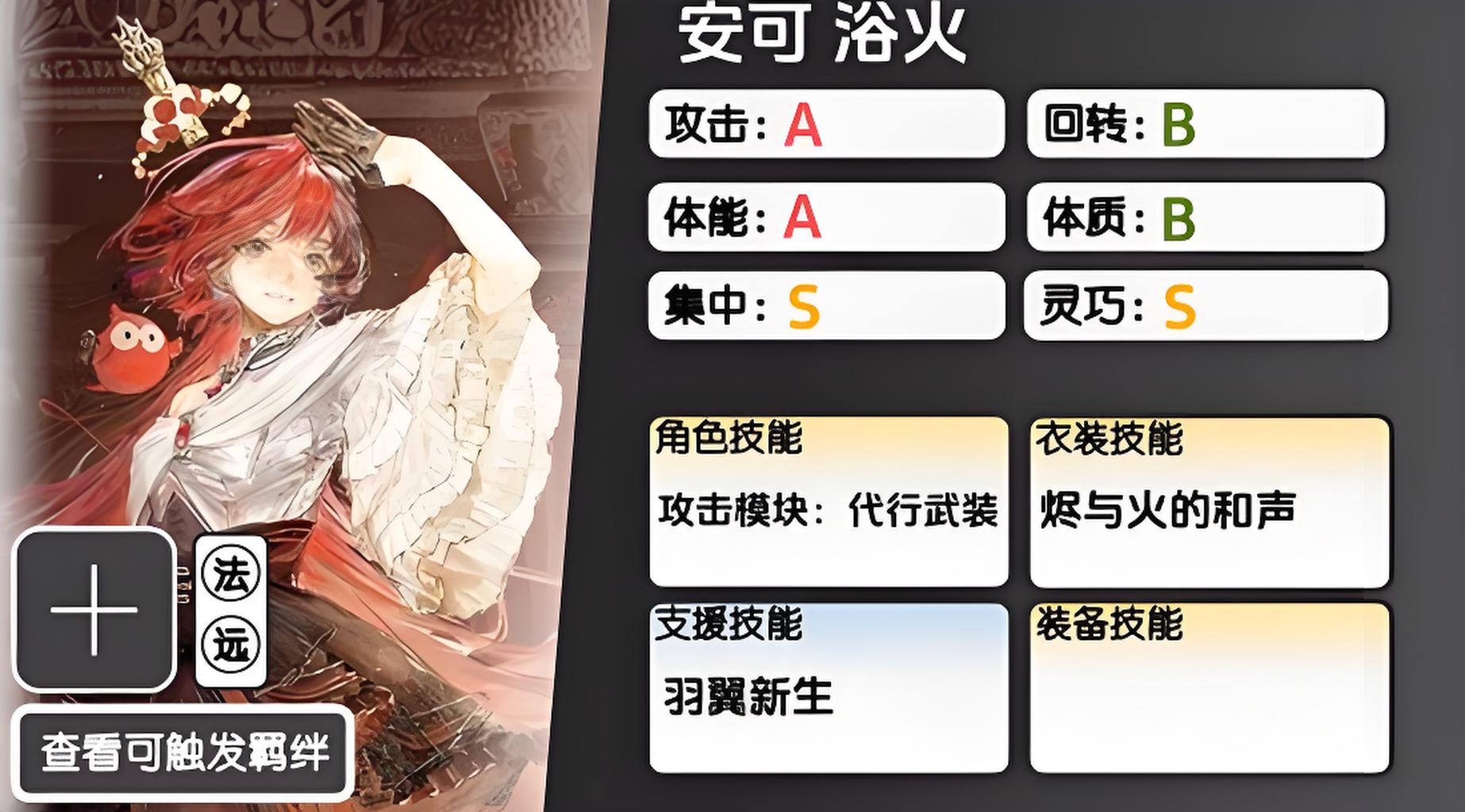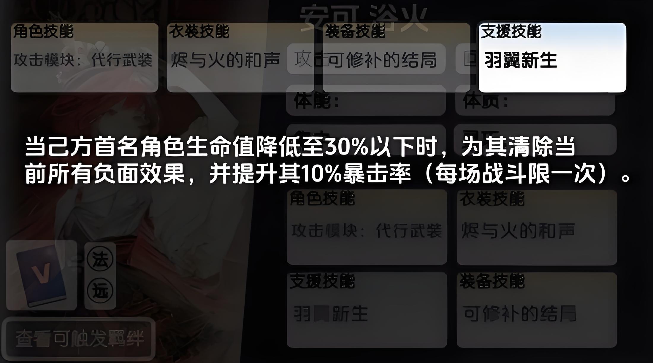 5、安可装备技能可修补的结局能让离场队友羁绊持续生效,支援技能羽翼新生可救队友,兼具输出与辅助。