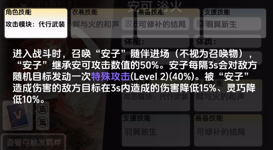 2、安可核心技能代行武装召唤随伴安子,安子不占召唤位继承50%攻击力,每3秒攻击敌人并削弱其伤害与灵巧。