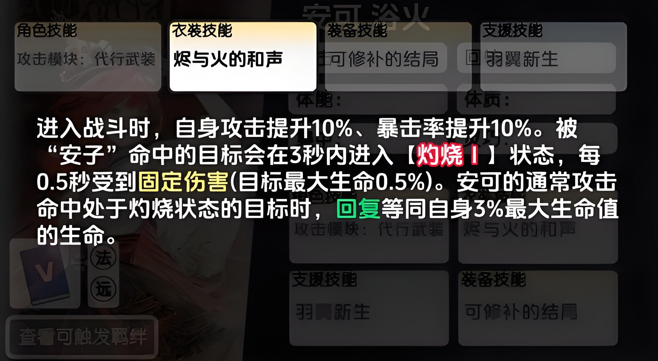 3、安可衣装技能烬与火的和声让她战斗开始获攻暴加成,安子命中目标触发灼烧,她普攻灼烧目标可回血。