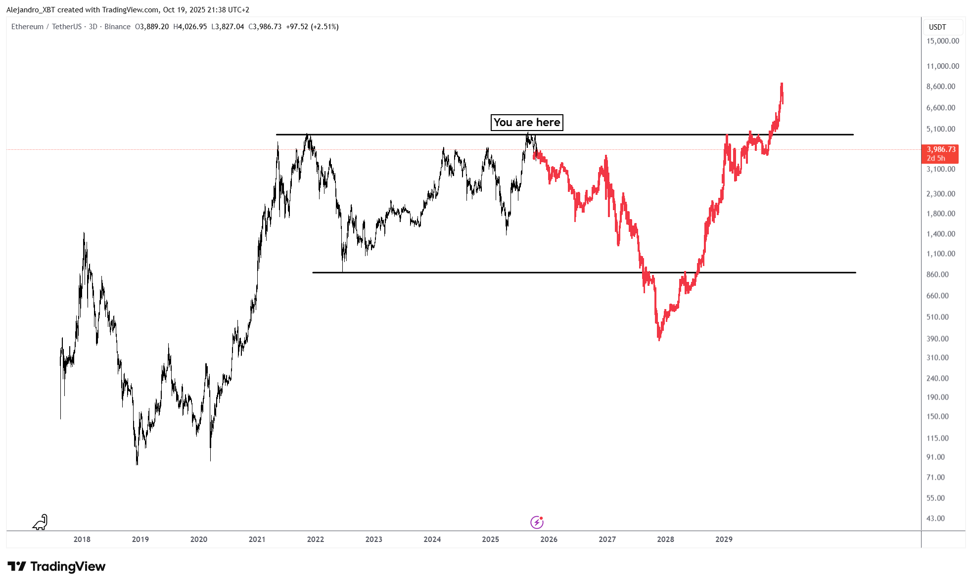 Alejandro₿TC近期在X平台发文预测,ETH可能先回调再开启冲击1万美元的"狂暴上涨"。