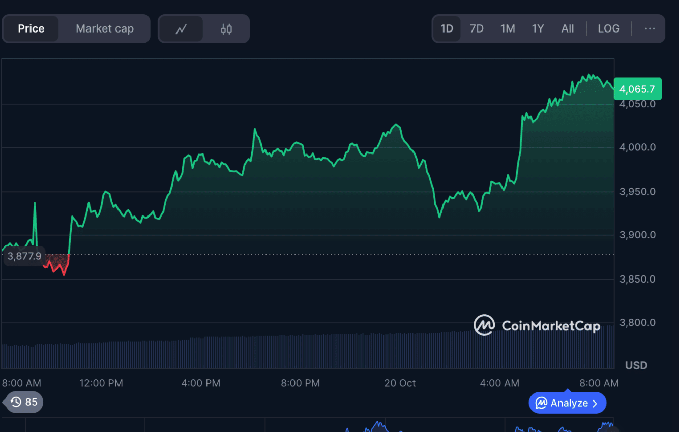 受此影响,市场情绪显著改善。ETH价格24小时上涨4.78%,跑赢比特币3.7%的涨幅。CoinMarketCap分析指出"W底"反转形态,预示10月可能延续上涨动能。