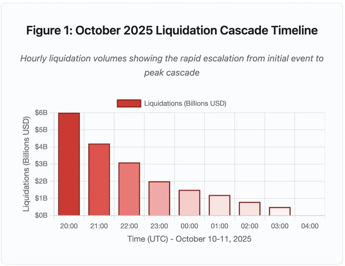 这场发生于 2025 年 10 月 10 日至 11 日的清算连锁事件,成为基础设施失效机制的典型案例。UTC 时间 10 月 10 日 20:00(北京时间 10 月 11 日 4:00),一项重大地缘政治公告引发市场普遍抛售。在短短一小时内,清算规模高达 60 亿美元。当亚洲市场开盘时,槓桿头寸的总体蒸发额已达 193 亿美元,波及 160 万名交易者帐户。