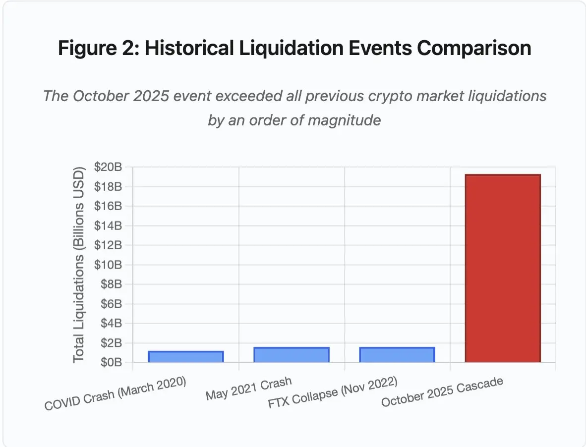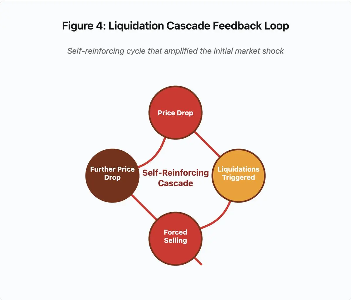 这些清算迫使更多卖单进入同一个缺乏流动性的市场,进一步压低了价格。保证金系统观察到这些更低的价格,并减记了更多的头寸。这个反馈循环将 6000 万美元的卖压放大了 322 倍,最终导致了 193 亿美元的强制清算。