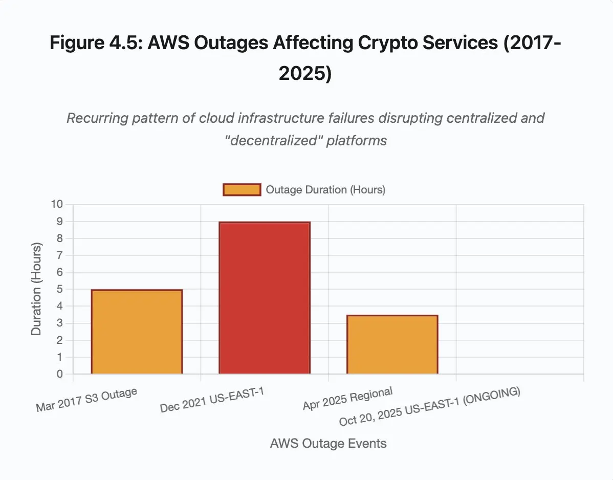 这些交易所将关键组件託管在 AWS 基础设施上。当 AWS 经历区域性中断时,多个主要交易所和服务会同时变得不可用。在中断期间——恰恰是市场波动可能需要立即採取行动的时候——用户无法存取资金、执行交易或修改头寸。