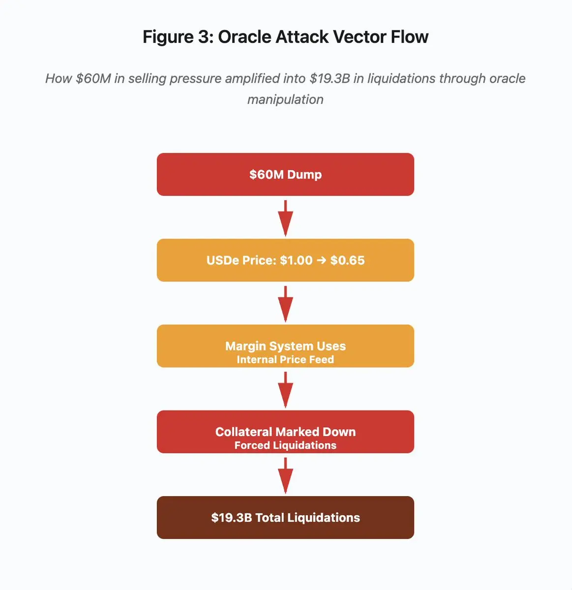 这次攻击利用了币安使用现货市场价格来为封装的合成抵押品定价的机制。当一名攻击者将价值 6000 万美元的 USDe 抛售到流动性相对稀薄的订单簿中时,现货价格从 1.00 美元暴跌至 0.65 美元。被配置为按现货价格标记抵押品的保证金系统,将所有以 USDe 为抵押品的头寸价值下调了 35%。这引发了追加保证金通知和数千个帐户的强制清算。