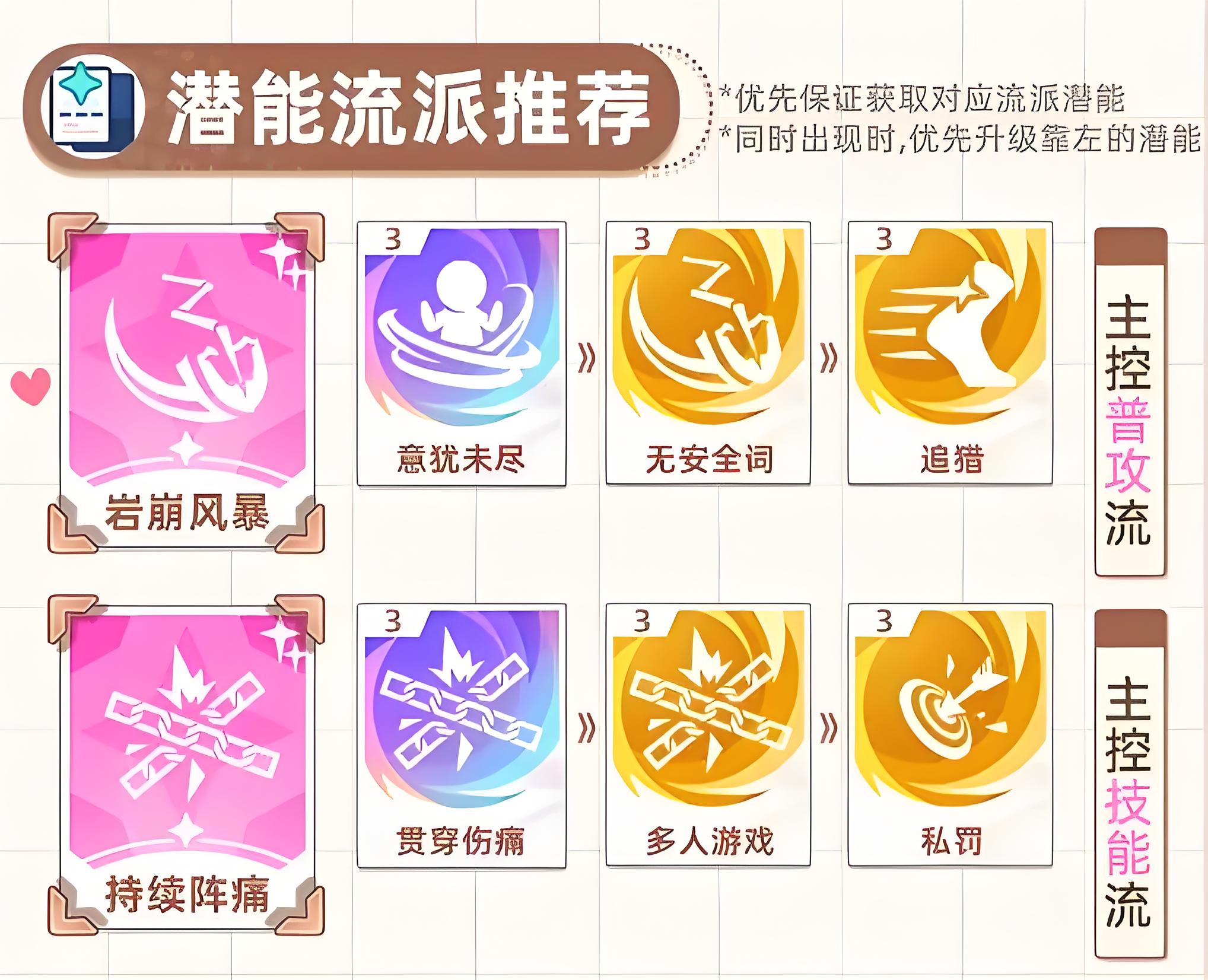 3、确定潜能流派方向,分主控普攻流与技能流,优先获取对应流派潜能,同时出现时优先升级靠左的潜能如岩崩风暴等。