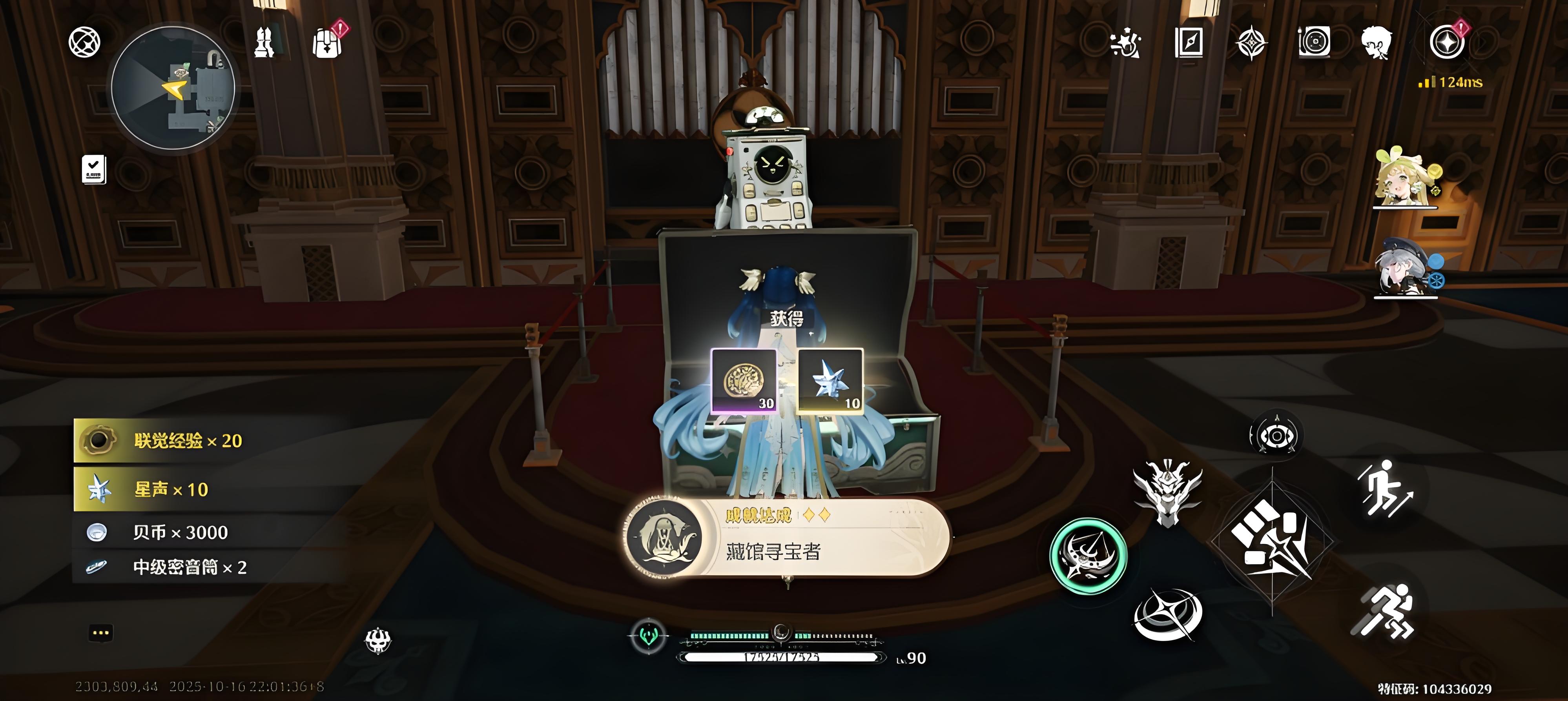 4、成功回答完四个机器人的所有问题后,不仅会有隐藏宝箱生成,还会直接弹出藏馆寻宝者成就的解锁提示,同时同步更新该成就的完成进度。