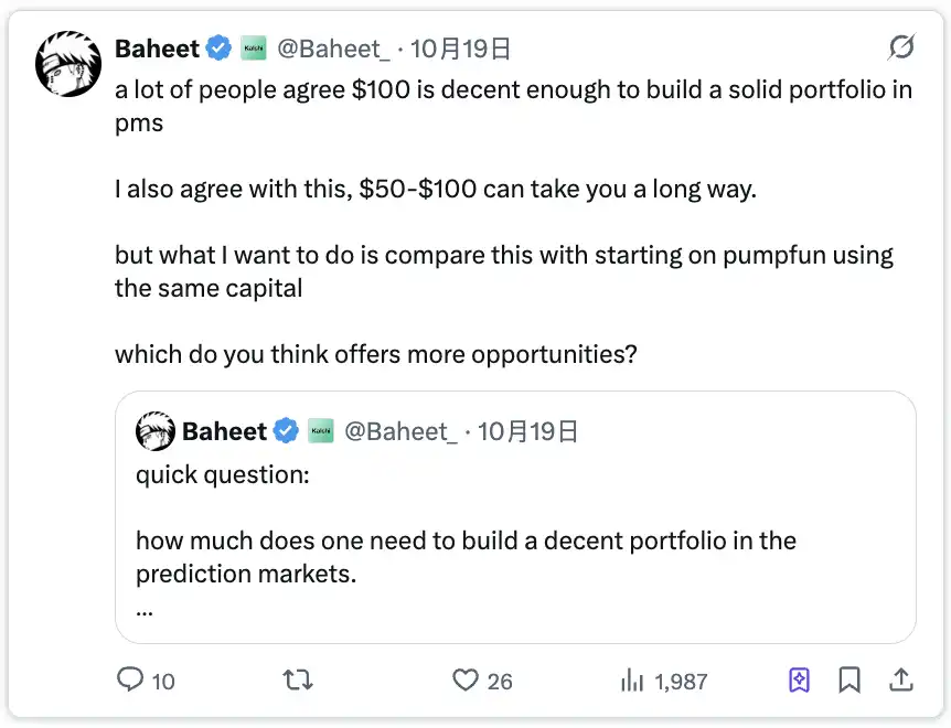 在最近的一篇贴文中,我提出了一个问题:在起始资本仅为 100 美元的情况下,交易 Memecoin(通过 Pumpfun 平台)和预测市场,哪一种能为交易者提供更多机会?