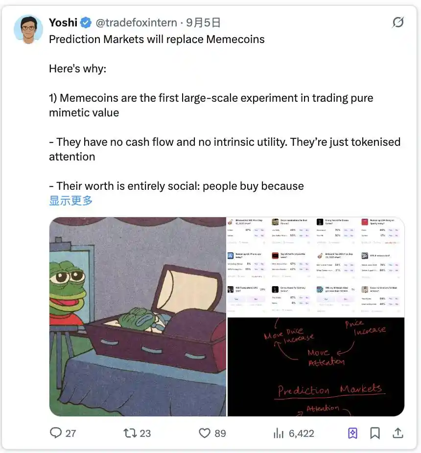 以下是一篇来自 @tradefoxintern 的优秀贴文,讨论为什么预测市场将取代 Memecoin :