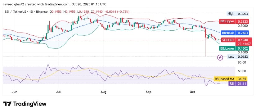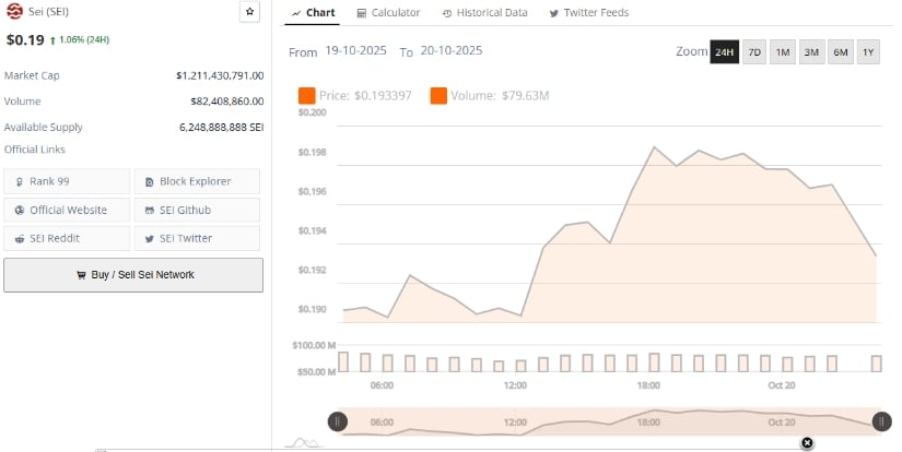 据BraveNewCoin数据,Sei现报0.19美元,24小时涨幅1.06%,市值12.1亿美元,日交易量约8240万美元。该代币全球排名第99位,流通供应量62.4亿枚。尽管日内小幅回升,整体情绪仍低迷,反映市场参与者正等待更明确反转信号。