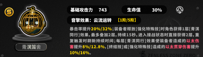 3、暴击率提升20%,装备者释放[强化特殊技]时角色获得1层[青溟同行]效果,最多叠加2层,持续15秒,进入接战状态时直接获得2层,重复触发时刷新持续时间,每层[青溟同行]效果使装备者造成的以太伤害提升8%,[终结技]或[强化特殊技]造成的以太贯穿伤害提升10%。