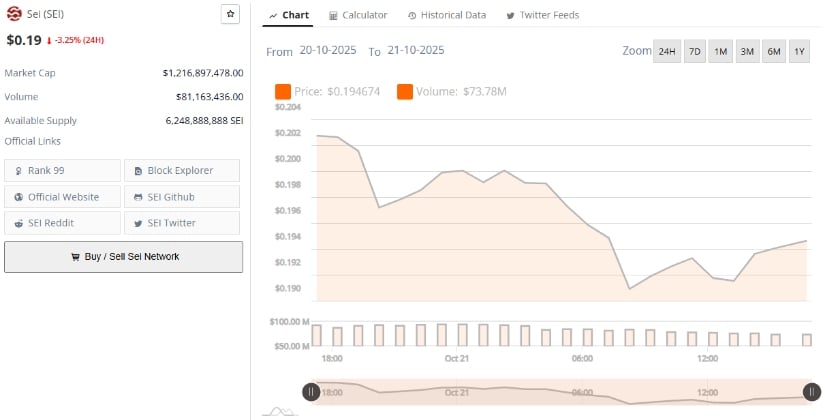 BraveNewCoin数据显示,Sei目前市值12.1亿美元,位列全球加密资产第99位。其24小时交易量达8116万美元,日内跌幅3.25%。尽管回调,6.24亿枚代币的流通供应量及主流交易所稳定流动性表明市场参与度持续,短期调整中仍保持韧性。