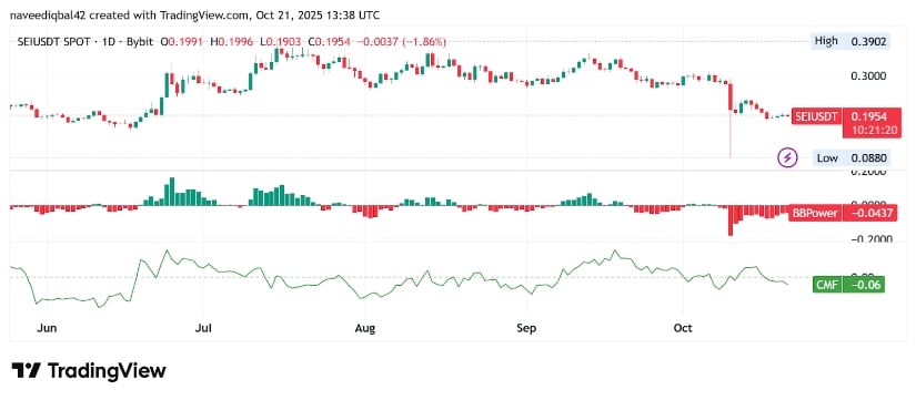 截至发稿,SEI/USDT交易对报0.1939美元,接近识别出的吸筹区间下沿。多空力量指标(BBPower)呈现-0.0433负值,显示短期空头主导。同理,资金流量指标(CMF)-0.07位于零轴下方,表明资金持续外流且买盘动能受限。