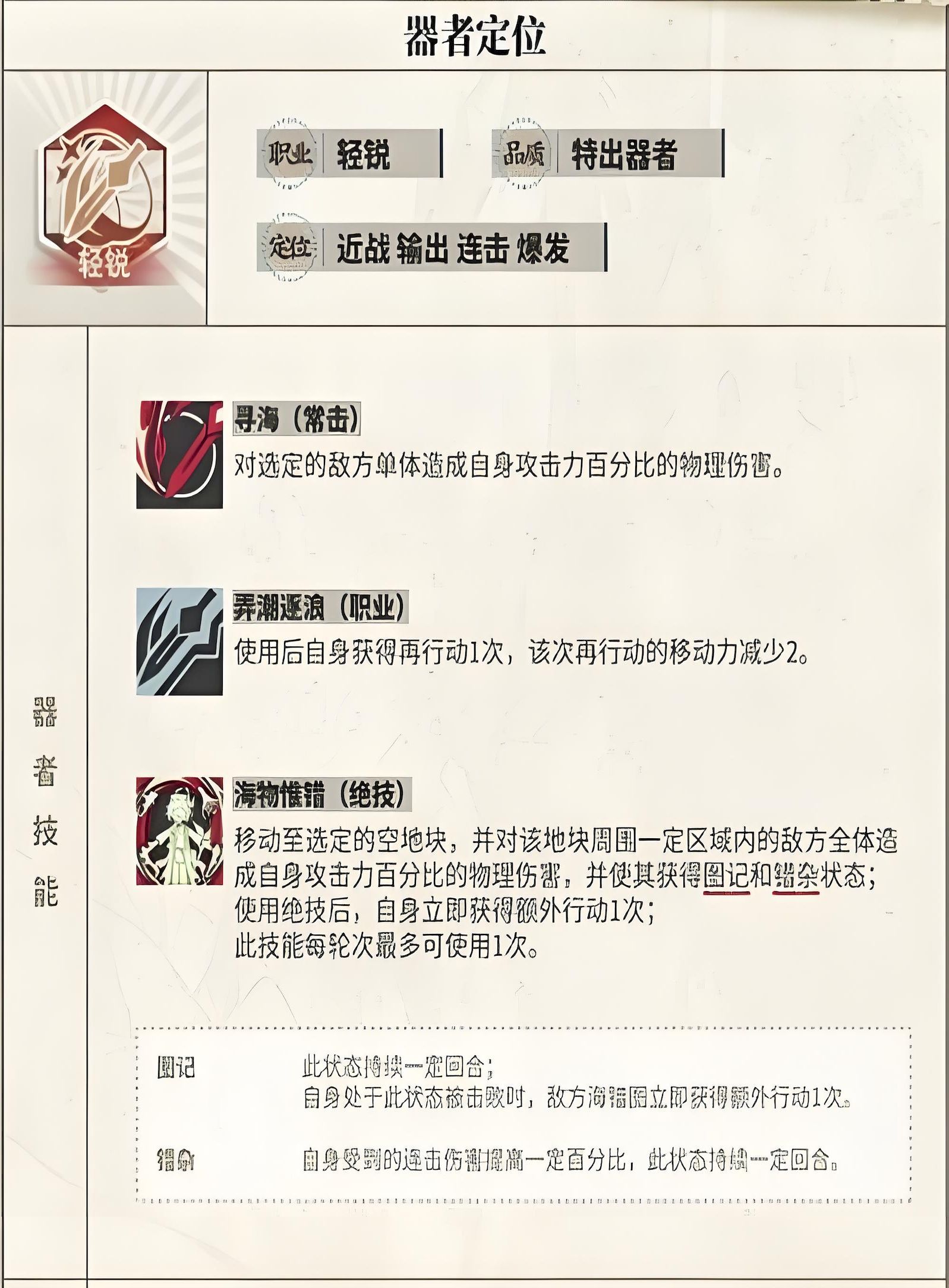 2、绝技需移动至空地块释放,对周围敌方全体造成攻击力百分比物理伤害,同时获得图记错杂状态,每轮战斗最多使用1次。