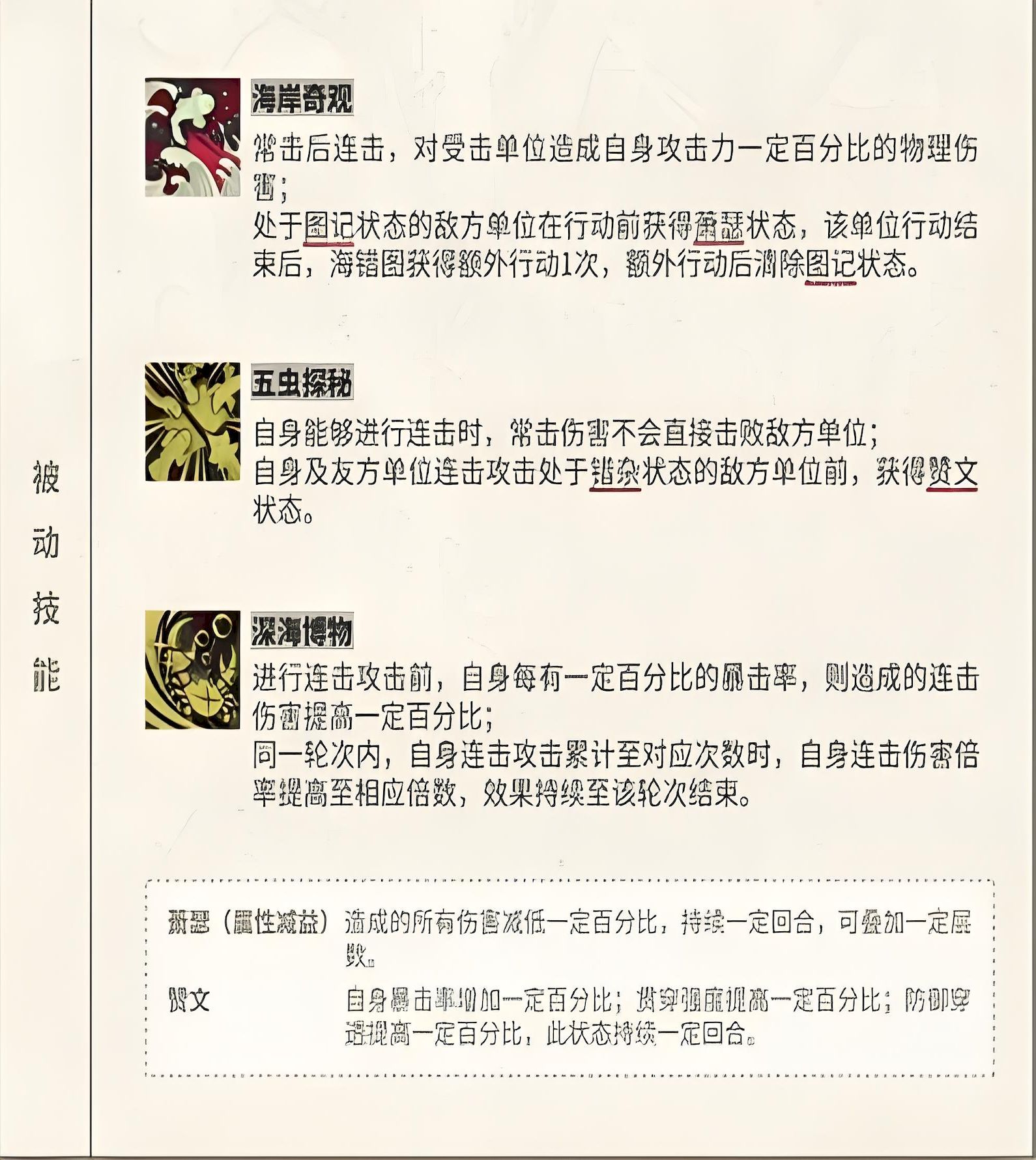 3、被动一让常击后触发连击,对受击单位额外造成攻击力百分比物理伤害,图记状态下敌方行动前会获得萧瑟状态。