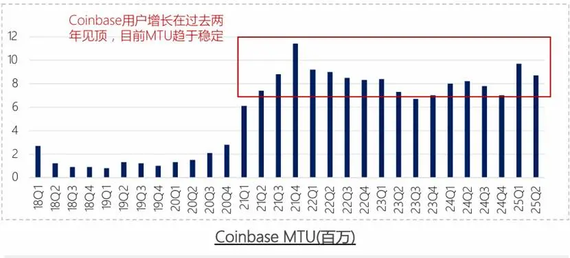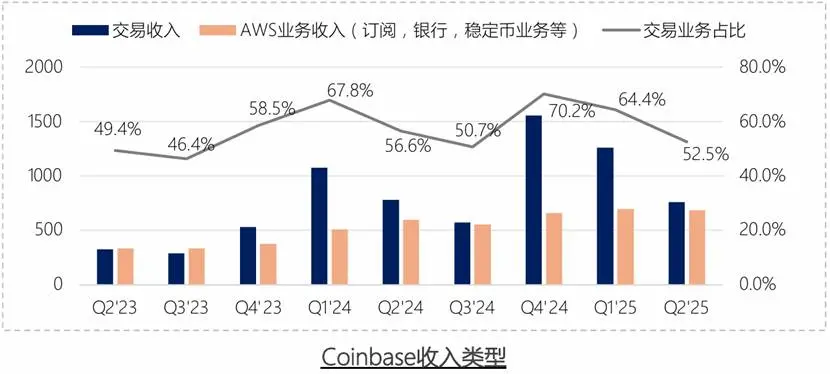 Q2 2025 股东信显示, Coinbase 当季收入 15 亿美元,净收入 14 亿美元,衍生品业务在 2025 Q2 出现放量,但主要是由于费率返利和做市激励,持续性存疑。 AWS 化业务仍处早期阶段,尚未完全抵消交易收入的波动。