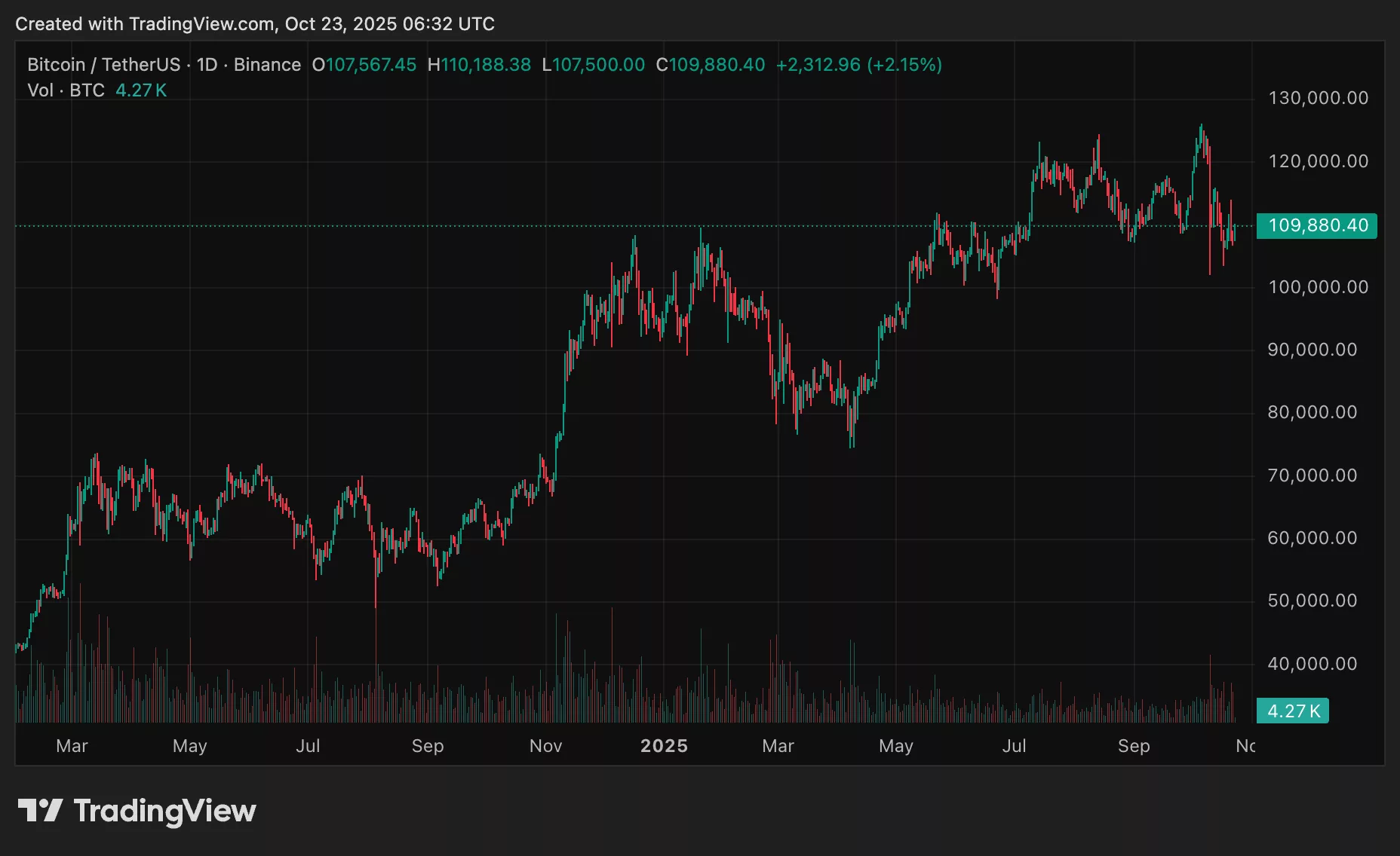 截至撰稿时,BTC报价109,783美元,24小时上涨1.5%,但周线仍下跌2.4%。在经历连日抛售导致价格跌破108,000美元后,该代币近日仅实现温和反弹。尽管短期有所回升,但低迷的交易量限制其上涨动能,比特币价格仍困于窄幅区间。
