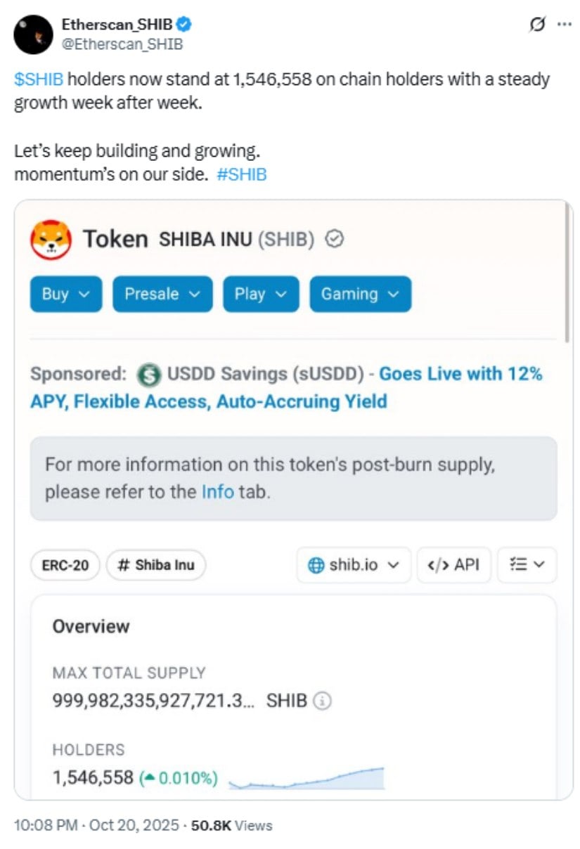 SHIB目前拥有1,546,558个链上持有者,反映每周稳定增长和持续社区动能。来源:Etherscan SHIB via X