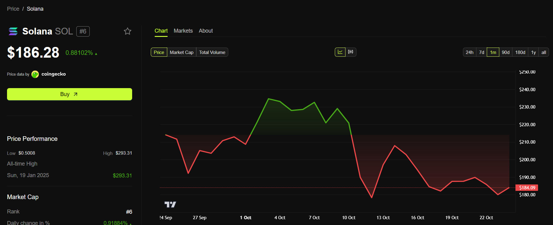 截至撰稿时,Solana(SOL)报价186美元。综合市场数据显示,该价格较2025年1月约295美元的历史高点仍有35%-40%跌幅。