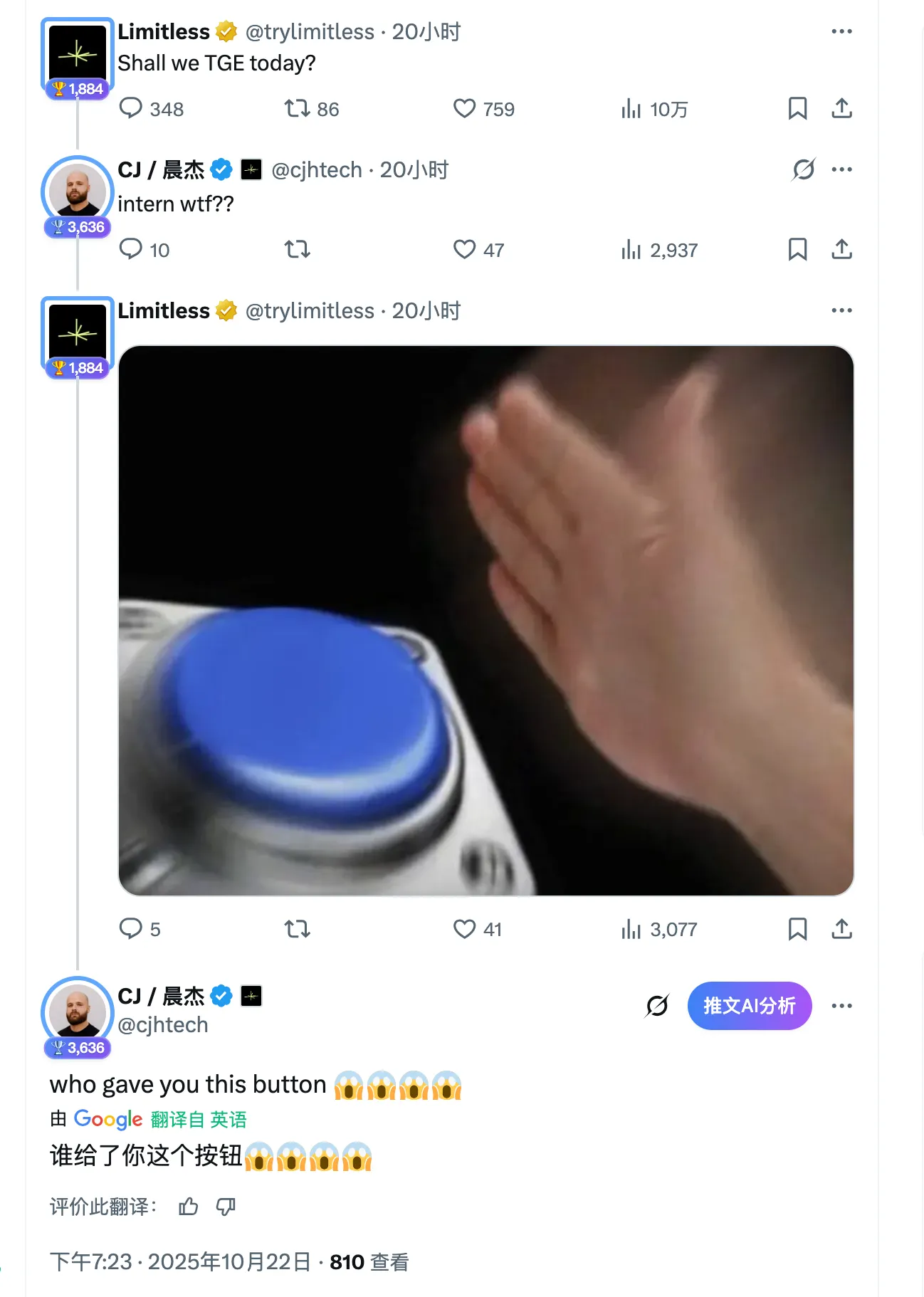 10 月 22 日晚 7 点半,预测平台 Limitless 突然 发文 :“Shall we TGE today?”
