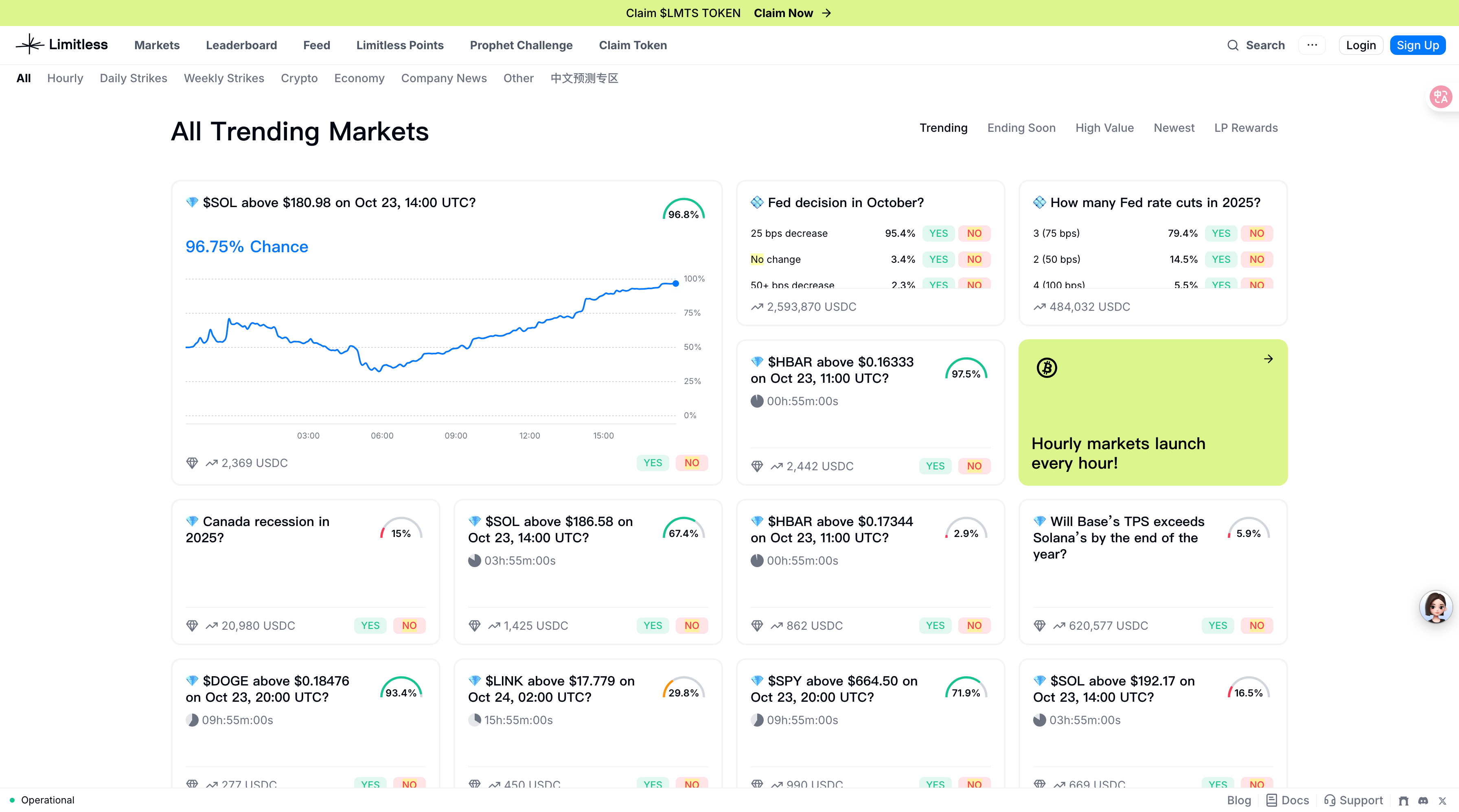 在机制上,Limitless 与 Polymarket 类似 :用户通过购买特定事件结果(通常为“是”或“否”)的股份参与预测,获胜股份在到期时按 1 美元结算,失败股份则失效。